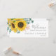 Cet en-tête de bienvenue est parfait pour un mariage campagnard. Le design floral bohème présente des tournesols jaunes, des fleurs roses rousses et une végétation d'eucalyptus vert chasseur dans l'aquarelle avec une élégante touche moderne de saumonier. La carte s'imprime à l'avant et à l'arrière (double face). Veuillez consulter la collection pour connaître les cartes de classement des sièges du numéro de table de coordination.