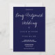 Un faire-part de mariage pour votre mariage longtemps reporté. Vous avez envoyé enregistrer les dates, puis modifier les dates, et éventuellement modifier les dates à nouveau. Mais maintenant, c’est enfin là. Reconnaissez ce que vous et votre invité connaissez déjà...cela fait longtemps qu'on en arrive là. Cette invitation est faite en bleu avec des lettres blanches et une nuance plus foncée de bleu sur le dos. Ajoutez simplement vos informations, ajoutez cet invitation à votre panier et profitez du mariage que vous attendez.