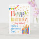 Une carte d'anniversaire colorée et textuelle pour un père pas à pas, avec du Polka Dot Bunting, des bougies d'anniversaire rayées et brillantes et parsemées d'étoiles à effet or. Le texte à motifs dit : "Joyeux anniversaire" et il y a aussi "Bonne journée !" en lettres bleues (NB, les étoiles et les contours de l'effet or seront vus et ne seront pas imprimés à l'encre métallique.)
