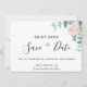 Une carte moderne Save the Date pour un mariage. Un arrière - plan blanc chic décoré d'une verdure d'eucalyptus vert aquarellée, de feuilles et de sprigs et d'une pivoine blanche aquarellée, fleurie. Personnalisez et ajoutez vos noms, la date et le lieu du lieu. Lettres de couleur noire. Le texte : Save the Date est écrit avec un grand script de style à la main tendance.