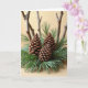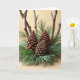 On this card, you'll see a beautiful picture 🌟 It shows three pine cones in the center, with lots of details on their brown scales 🌲 The pine cones are surrounded by fresh and green pine needles, making a nice contrast. Everything looks balanced and calm, with a soft light shining on them 🌞 In the background, there's a cozy beige color and blurry branches 🌿 This picture reminds you of the peaceful and lovely forest 🌲🌳 It's perfect for spreading holiday cheer and warm wishes to your friends and family 🎄🎁✨