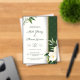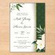Une élégante invitation de mariage avec un design floral blanc et vert avec des feuilles luxuriants et des fleurs sur le côté gauche, complétée par un arrière - plan à motifs vert foncé avec une bande verticale dorée sur la droite. Le texte invitation les invités à la célébration mariage de Matt Zhang et Shawn Garcia, prévue pour le dimanche 10 mars à 21h00 à 123 Anywhere St, Any City, avec une réception à suivre. Les détails de la RSVP comprennent un site Web (www.reallygreatsite.com) et un numéro de téléphone (+123-456-7890), se terminant par un message chaleureux qui attend avec impatience de célébrer avec les invités.