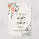 Une carte de faire-part de mariage douce et crémeuse, aux motifs floraux délicats et dessinés à la main dans des tons pâles de pêche, de lavande et de menthe, qui dégage un sentiment de romantisme apaisant. Les fleurs sont éparpillées sur la carte dans un motif fantaisiste et organique, à la texture subtile et à l'ombrage doux qui donne au design un sens de profondeur et de dimensionnalité. L'esthétique générale est sobre mais élégante, parfaite pour transmettre la joie et l'intimité de la journée spéciale. L'agencement de l'invitation est propre et simple, avec un grand espace blanc pour créer un sentiment d'respiration et de sophistication, permettant aux belles illustrations florales de prendre le centre de la scène. La texture de la carte est lisse, avec un éclat subtil qui capte la lumière, lui donnant une sensation luxueuse.