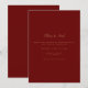 Cet élégant script or & carte de faire-part de mariage rouge foncé dispose d'un script moderne et du texte propre pour un design rouge profond simple et élégant que vous aimerez. Ajoutez du texte personnalisé pour fournir toutes les informations supplémentaires nécessaires à vos invités. N'hésitez pas à m'envoyer un message pour toute question liée au design - Je serai heureux de vous aider!