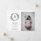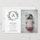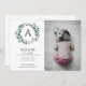 Carte Faire-part de naissance fille Monogramme Wreath. Annoncez votre lot de joie avec cette jolie carte de faire-part en monogramme de couronne verte. Customisez avec la photo de votre bébé, modifiez le filtre de la photo, changez les polices et les couleurs de police, et ajoutez les propres informations de votre petit pour personnaliser cette carte avec vos touches spéciales.