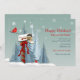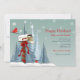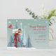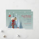 Une carte de faire-part de vacances/déménagement à envoyer tôt en famille et entre amis. Les pins enneigés et les flocons de neige qui tombent créent un décor pour la boîte aux lettres décorée et les oiseaux cardinaux.