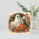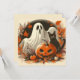 Voici une illustration d'Halloween au look vintage d'un fantôme avec une citrouille et un chat noir. Cette carte au look rétro montre le fantôme sur un fond de feuilles de couleurs automnales. C'est une carte mignonne avec un look rétro et c'est une excellente carte d'Halloween et est parfaite pour les salutations de la saison effrayante, les invitations ou pour accompagner un cadeau.