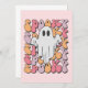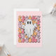 Ce design amusant et festif pour Halloween présente une illustration de fantôme classique à l'avant et au centre, entourée du mot "Spooky" répété dans une police en gras et bouffante. Le texte est superposé dans des couleurs vibrantes et rétro, comme des roses doux, des violets et des oranges, créant un contraste ludique avec la silhouette blanche simple du fantôme. Les yeux noirs sans expression du fantôme ajoutent une touche de charme inquiétant, tandis que la typographie ondulée et empilée donne au design une ambiance groovy et nostalgique.