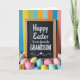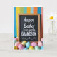 This greeting card features a festive scene centered on a rectangular black message panel with a natural wood-toned frame. Across the middle, the text reads “Happy Easter to our favorite GRANDSON,” with “Happy Easter to our favorite” in white and “GRANDSON” in larger, all-cap white lettering for extra emphasis 🐰. At the base of the frame, a generous pile of egg-shaped decorations gathers close together, like they’ve been arranged with extra care for someone special. The eggs are colored in soft pink, yellow, sky blue, and mint green, and several show stripes and zigzag patterns that add a sweet, friendly energy 🐇. Behind everything, tall vertical stripes in deep blue, sunny yellow, green, light blue, orange, and coral set a lively backdrop that makes the framed message stand out. The lighting is even and gentle, letting the wood frame look warm and the colors feel fresh without harsh shadows. The striped background runs from top to bottom, while the patterned eggs cluster tightly along the lower edge of the framed sign.