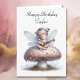 Carte d'anniversaire personnalisée avec une petite fée mignonne assise sur un champignon avec des gouttes de pluie jouant l'ukulele.