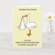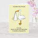 Dessin d'un nouveau bébé tenant dans un drap blanc accroché au bec d'une grande cigogne. Les mots "Félicitations, vous êtes sur le point d'être promu comme une grande soeur".