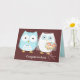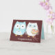 Un marié de hibou bleu clair portant une cravate arc et une chemise fantaisie fantaisie se tient la main avec sa mignonne mariée au hibou tenant un bouquet de fleurs coloré. Une carte de félicitations amusante pour le nouveau Mr et Mme Text peut être personnalisée avec votre propre salutation spéciale pour le couple heureux. Une carte originale de félicitations pour les mariages qui se marient.