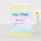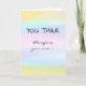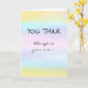 Célébrez une grande réussite professionnelle de votre collègue, ami ou aimé avec cette carte! Le message est un jeu de mots du philosophe René Descartes : "Je pense, donc je suis" ("cogito ergo sum"). Le recto de la carte dit : "VOUS PENSEZ", suivi de "donc vous êtes..." En ouvrant la carte, le texte poursuit : "TENUES ! Félicitations !" L'avant de la carte a un effet de lavage pastel à l'aquarelle en jaune, bleu clair, rose et violet pâle. Parfait pour tous ceux qui ont obtenu leur diplôme d'études!