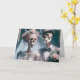 Une mariée et un marié squelettique sont représentés vêtus d'une tenue mariage complexe, avec la mariée ornée de fleurs et d'un voile, et le marié portant un chapeau et une cravate arc