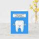 Dessin d'une dent disant "Félicitations pour la perte de votre première dent". L'image est placée contre un arrière - plan de couleur bleu vif.