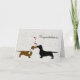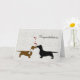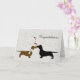 Carte de vœux de félicitations pour mariage / fiançailles fantaisiste sur un fond damassé élégant en blanc. Les silhouettes d'un teckel marron et d'un teckel noir se font face, avec des cœurs rouges qui flottent vers le haut. Personnalisez tout le texte, à l'avant et à l'intérieur pour répondre à vos besoins. La carte de vœux parfaite pour les amoureux de doxie.