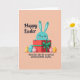 This card features a cute long-eared bunny in soft light teal 🐰, peeking out of a bright red gift box tied with a deep green ribbon and a neatly looped bow. The bunny’s eyes are closed in a gentle smile, with a rosy blush that feels like a shy, affectionate moment shared with someone close. Around the box, several decorated egg shapes float like a friendly circle of little surprises, adding a sense of togetherness to the scene. The eggs show sunny yellow stripes, turquoise polka dots, pale pink diagonal lines, and a rich magenta swirl, each pattern looking like a small note passed between friends. A warm peach background keeps everything cozy and lets the reds, greens, and pastels stand out without feeling harsh. A flowing cursive-style message sits near the top and bottom in a dark contrasting color, framing the illustration with an easy, romantic touch 🌷. The shading is light and smooth, and the green bow on the box has crisp loops and trailing ribbon ends.