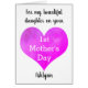1ère carte de Fête des Mères pour la fille qui présente un coeur pourpre, qui dit "1ère Fête des Mères". Le message de la carte intérieure dit : "J'espère qu'aujourd'hui et chaque jour est rempli de beaucoup d'amour, de rire et de plaisir. Bonne fête des mères !" Le message de la Fête des Mères peut être facilement édité. Le dos de cette carte de Fête des Mères a le même coeur avec l'année, que vous pouvez facilement modifier.