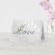 LOVE texte dans une police de script élégante avec des feuilles verts sur satin blanc damask arrière - plan pour féliciter les jeunes mariés