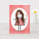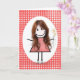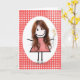 Mignonne fille stick figure avec de longs cheveux roux, baskets, robe gingham, collier de perles et bouquet de marguerites sur fond gingham rouge et blanc.