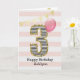 Une carte d'anniversaire de 3 ans rose et or pour fille, que vous pouvez personnaliser avec son nom. Le devant de cette belle carte d'anniversaire des 3 ans pour elle présente le chiffre trois dans une rayure noire et blanche avec un contour de paillettes avec un ballon rose prêt à s'envoler. Veuillez noter que les paillettes dorées sont un effet de design et qu'il n'y aura pas de paillettes réelles sur cette carte d'anniversaire. Le fond est un blanc et rose doux avec une banderole dorée en haut. Le message à l'intérieur peut être facilement personnalisé si vous le souhaitez. Un joli souvenir de carte d'anniversaire de 3 ans pour elle.