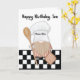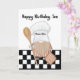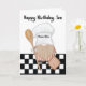 Certainement ! Une carte d'anniversaire de Son, charmante et fantaisiste, avec une délicieuse boulangerie de gnome. L'avant de la carte présente un adorable gnome portant un charmant casquette de boulanger, immergé dans la joie de la cuisson. Avec une cuillère en bois à la main, le gnome exsude une expression ludique et espiègle, rayonnant un sentiment de chaleur et de bonheur. Le gnome est dressé contre un arrière - plan noir élégant orné de à damiers motifs, créant un contraste visuel saisissant et ajoutant une touche de sophistication au design.