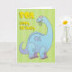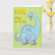 Gros dinosaure bleu mangeant une feuille, avec un message d'anniversaire à fils sur un arrière - plan vert.