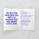 Une carte réconfortante et humoristique à un fils sur son anniversaire ! L'avant de la carte montre un homme habillé en tant que garçon soufflant ses bougies d'anniversaire ; Une manière humoristique de voir un fils par des mères observe. À l'intérieur de lit un poème que j'ai écrit : Je vous ai observés vous développer, vous avez transformé d'un garçon à un homme, et je veux juste que vous sachiez fier d'une mère je suis. Votre liste d'accomplissements mettrait les la plupart pour shame, votre nom est mériter d'une telle grande renommée. Votre halo de la moralité couvre toutes les vies où vous touchez, mon fils, je t'aime, tellement beaucoup ! Tellement joyeux anniversaire mon cher fils, et peut votre jour être rempli de beaucoup d'amusement. Peut votre anniversaire prouver aussi spécial que vous, puisque j'ai observé comme vous vous êtes développés, d'un garçon à un homme, et je veux juste que vous connaissiez, combien fier d'une mère je suis vraiment ! Amour, maman