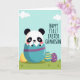 Designed with a sweet spring scene, this card features a round-faced baby animal with black patches around its eyes and ears, peeking out of a large eggshell as if just arriving for a first celebration 🐰. The little creature’s soft pink cheeks and gentle, forward-leaning pose give it an affectionate, almost cuddly look. The oversized shell is teal with a wide purple band, sitting low in a grassy foreground that feels fresh and welcoming. Around it, smaller decorated eggs in sunny yellow, striped teal, and spotted purple rest in the grass like they were placed there for a shared family moment 🌷. A light blue sky stretches behind everything, dotted with puffy white clouds that keep the scene calm and bright. On the right side, the text reads “HAPPY FIRST EASTER GRANDSON” in uppercase letters, set in a dark tone that stands out clearly against the pale sky. The words are stacked in a neat column so the message balances the character on the left. In the background, the clouds are rounded and lightly shaded against the soft blue sky.