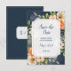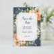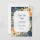 Annoncez votre mariage à l'élégance rustique en utilisant cette carte Save the Date qui présente des fleurs d'aquarelle dans les tons bleu marine, pêche et ivoire. Son écriture moderne et son agencement classique en font un lieu idéal pour les cérémonies de mariages rustiques ou de jardins. Entièrement personnalisable avec vos noms, date et détails de l'événement.