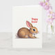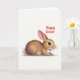 This design shows a small bunny 🐰 resting low on the left side of a simple, pale background, its body tucked in as if waiting for a gentle hello. The fur is shaded in warm browns and creamy tones, with a soft pink tint inside the ears and on the nose that adds a tender, affectionate look. Its dark, glossy eyes glance toward the right, and the tiny light reflections in them feel like a quiet, friendly exchange across the open space. Fine whiskers and a rounded little tail are detailed with soft highlights, giving the bunny a cozy, touchable texture. In the upper-right corner, a short Easter greeting sits in red, written in flowing cursive-style lettering that curves lightly above the bunny’s gaze. The wide, uncluttered background leaves room for the message and makes the bunny’s calm pose stand out, like a sweet pause shared between close friends 🌷. A gentle, diffused light falls across the scene, with the greeting in red at the top right and the bunny’s warm brown-and-cream body anchored at the lower left.