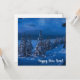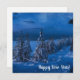 Paysage d'hiver avec pins et sapins enneigés au clair de lune à la nuit étoilée. Vue panoramique de la forêt de conifères avec sentier en bois près de la côte de la mer contre un beau ciel nocturne avec étoiles