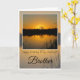 Joyeux frère d'anniversaire. Beau lever de soleil orange derrière silhouette de chêne, réfléchi sur le lac avec des roseaux noirs au premier plan. Le texte dit : Joyeux anniversaire à mon merveilleux Frère. La carte intérieure est vide.
