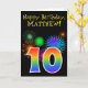 L'avant de cette carte de voeux d'anniversaire amusante et vibrante présente un motif coloré inspiré par les feux d'artifice festifs, ainsi que le numéro "10" avec un motif multicolore en dégradé d'inspiration arc-en-ciel, sur un arrière - plan de couleur noire. L'avant comporte également un message de voeux d'anniversaire, y compris un nom de destinataire personnalisé. L'intérieur comporte un message d'anniversaire personnalisé, ou pourrait être effacé et laissé vide si un message doit être écrit à la main à la place. Une carte d’anniversaire personnalisable comme celle-ci pourrait être une façon amusante d’envoyer un message pour célébrer le dixième anniversaire de quelqu’un. [~Z0000330]