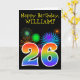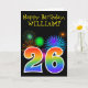 L'avant de cette carte de voeux d'anniversaire amusante et vibrante présente un motif coloré inspiré des feux d'artifice festifs, ainsi que le numéro "26" avec un arc-en-ciel multicolore comme un motif dégradé, sur un arrière - plan de couleur noire. L'avant comporte également un message d'anniversaire, y compris un nom de destinataire customisé. L'intérieur comporte un message de voeux d'anniversaire personnalisé, ou peut-être pourrait-il être effacé et laissé vide si un message doit être écrit à la main à la place. Une carte d'anniversaire personnalisée comme celle-ci pourrait être une façon amusante d'envoyer des voeux d'anniversaire à quelqu'un qui célèbre son vingt-sixième anniversaire. [~Z0000330]