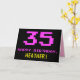 The front of this fun, geeky, and nerdy birthday greeting card design features a large pink number "35", along with the message "HAPPY BIRTHDAY," in pink, and a bold yellow editable recipient name. The text has a look inspired by that of classic 8 bit style video game and top graphics from the 1970s and 1980s, and the background is colored black. The inside has a personalized birthday greeting message, or could perhaps be cleared and left blank if a message is to be written by hand instead. A silly customizable birthday card like this might be a fun way to send a message celebrating somebody’s thirty fifth birthday. [~Z0000478]