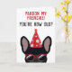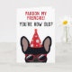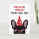 Cette drôle de carte d'anniversaire de bulldog en France est sûr de mettre un sourire sur le visage du garçon ou de la fille d'anniversaire qui a un sens de l'humour. Le dessin est illustré d'un cool à l'air noir de couleur française bulldog portant un casquette de fête rouge et des lunettes de soleil avec la mention "Pardon mon frenchie! Vous êtes comme vieux" écrit sur le devant. Ce design est également disponible avec différents bulldogs français colorés.