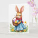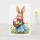 This card shows a light brown, upright bunny-like character with long, expressive ears and a wide open smile that feels like it’s meant for someone special 🐰. It wears a sky-blue dress with small white flower details, plus a deep red scarf wrapped neatly at the neck, giving the pose a cozy, caring look. The character holds a woven basket close to its body, as if offering it with friendly affection. Inside the basket sit four smooth eggs in soft pastel purple, pink, yellow, and pale blue, each catching a gentle highlight. The background stays bright white, keeping all attention on the character and its tender, inviting stance. A short greeting appears near the top in a soft, medium-weight style, set in a light spring color that stands out without being harsh. Near the bottom edges, a few green leaves and small yellow blossoms rise into view like early spring 🌷. Fine whiskers, rosy cheeks, and crisp outlines finish the scene, with the flowers clustered low and slightly to the sides.
