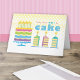 Un grand gâteau d'anniversaire avec une glace pastel brillante surmontée de bougies vertes est posé sur le côté du texte qui dit "aujourd'hui il y aura du gâteau". Trois tranches de gâteau de 4 couches sont disposées sous le texte et un pois jaune et blanc est l'arrière - plan de ces desserts traditionnels d'anniversaire. ©Mindy Pierce