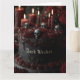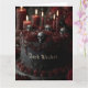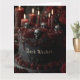 Un gâteau gothique luxueux et détaillé avec minutie, présentant un glaçage noir lisse orné de roses en beurre rouge foncé élaborées et d'autres motifs de fleurs en tube. Le gâteau est surmonté de plusieurs petits crânes métalliques et de bougies rouges allumées qui jettent une lueur chaude et vacillante. La phrase "Dark Wishes" est inscrite sur son côté en élégante écriture dorée. La scène entière est plongée dans une atmosphère sombre et maussade, entourée de bougies et de roses supplémentaires, ce qui en fait une pièce maîtresse parfaite pour une célébration d'anniversaire alternative, une fête d'Halloween ou tout événement ayant un thème de fantasy sombre ou macabre.