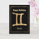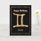Envoyez une carte de voeux Happy Birthday personnalisée à votre Gemini préféré avec cette Gemini en or martelé stylisé Gemini l'astrologie Twins signe en or double ligne cadre sur un arrière - plan noir. Le texte du Joyeux Anniversaire et du Zodiaque sur le devant de la carte peut être personnalisé si vous avez un autre message d'accueil en tête. À l'intérieur de la carte, vous pouvez ajouter le nom de la fille ou du garçon d'anniversaire au-dessus du texte qui dit : Vous allez avoir un anniversaire formidable, il est écrit dans les étoiles. Une carte personnalisée amusante pour quelqu'un né sous le signe étoilé de Gemini.