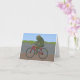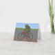 A dark green frog wearing a tan plaid ivy cap (or driving cap) and a satisfied smile pedals along on a red bicycle on a dirt road by a moss-covered gray stone wall in the mixed media image on this note card. With deep blue skies above, it looks like he has a beautiful day for cycling! From my original digitally created Image.