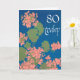 Une jolie carte d'anniversaire du 80ème anniversaire, avec des géraniums rose saumon sur un arrière - plan bleu profond et des lettres blanches élégantes. À partir d'un design imprimé à l'écran par Judy Adamson, vous pouvez personnaliser le message intérieur si vous le souhaitez.