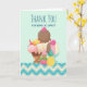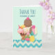 Une carte de remerciement avec un message à l'intérieur vous pouvez personnaliser. Illustré avec le dessin d'une crème glacée à 3 boules sundae avec des arrosages colorés. Un cône glacé avec des boules de chocolat, fraise et glace vanille. Un bol de glace néopolite avec une cerise sur le dessus. Des fraises et un ananas sont assis à côté des bols. Été et sucré.Un motif en chevron crème et bleu sur le bord inférieur.