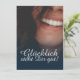 Glücklich steht Dir intestin ! Kompliment Karte mit lachendem Frauengesicht und handschriftlichen Grüßen auf der Vorderseite der Karte. Restliche Flächen stehen zur freien Verfügung.