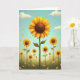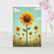 The front design shows a tall golden flower rising from a field, its wide petals opening toward a calm blue sky like an affectionate reach ❤️. Around it, smaller yellow blooms dot the scene in a loose cluster, suggesting friendly company as they lean in the same direction. The ground is painted in muted greens and warm earth tones, with soft layers that make the field feel deep and gently rolling. Above, pale white clouds float across the upper area, and a few golden-orange leaves drift through the air as if carried between close companions on a light breeze 🌼. The main petals glow in marigold and amber shades, contrasted by a dark brown center with a slightly textured look. A short line of text sits near the top in a light color that stands out against the blue sky, while a smaller line rests near the bottom in a darker tone over the green field. The sky shows scattered clouds and several golden-orange leaves crossing diagonally from upper left toward the center.