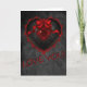 A dusky black lace background and a black lace heart with red lace frills, a large red jewel and big satin bow. A Romanti greeting card with a gothic touch.