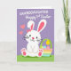 This card shows a white bunny with pink inner ears and paw pads, wearing a small pink bow on one ear, and its rosy cheeks and gentle smile suggest a sweet bond 🐰. The bunny sits low and centered on a bright green strip of ground, as if posing for a treasured springtime moment. To the bunny’s right is a basket with soft pastel stripes, filled with egg shapes in light spring colors that hint at a first seasonal celebration. Above the illustration, the word “GRANDDAUGHTER” appears in uppercase lettering, with “Happy 1st Easter” placed nearby in a lighter, flowing style. The lettering is set high on the lavender background, standing out clearly without crowding the scene. Small hearts float near the bunny’s head, adding a tender, affectionate note like a quiet message between loved ones 🌷. The background stays a calm lavender while the green ground forms a neat base line under the bunny and the basket.