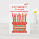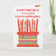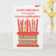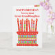 Vous pouvez ajouter l'âge à cette carte d'anniversaire aux couleurs vives pour votre petite-fille, avec un gâteau d'anniversaire aux fraises. Le gâteau a beaucoup de bougies avec différents motifs et il y a une bande à motifs autour du gâteau avec des fruits d'été colorés - fraises, framboises, citron vert et tranches d'orange. Au-dessus du gâteau, l'accueil, en lettres rouges, est "HEUREUX ANNIVERSAIRE à une grande petite-fille très spéciale" et sur le gâteau il y a un espace pour ajouter l'âge, suivi par "ans today !" en lettres blanches. N'hésitez pas à customiser le message intérieur si vous le souhaitez ; vous pouvez changer la police et la couleur ainsi que le message.