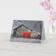 vieille grange patinée dans la neige avec portes rouges et couronne de Noël